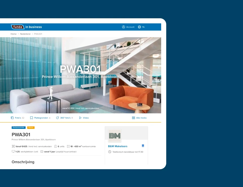 Bedrijfsmakelaars vinden het prettig om gebouwen met verschillende bedrijfsunits op één pagina te presenteren. Voorheen benoemden makelaars daarom alle units in de omschrijving, maar dit was bij veranderingen in beschikbaarheid niet ideaal. Ook is minder duidelijk welke foto bij welke unit hoort. Na een pilot met bedrijfsmakelaars hebben we een nieuw product ontwikkeld: Bedrijfsverzamelgebouw. Een landingspagina per gebouw – geschikt voor alle typen bedrijfsvastgoed – waarop je onbeperkt units kunt toevoegen.