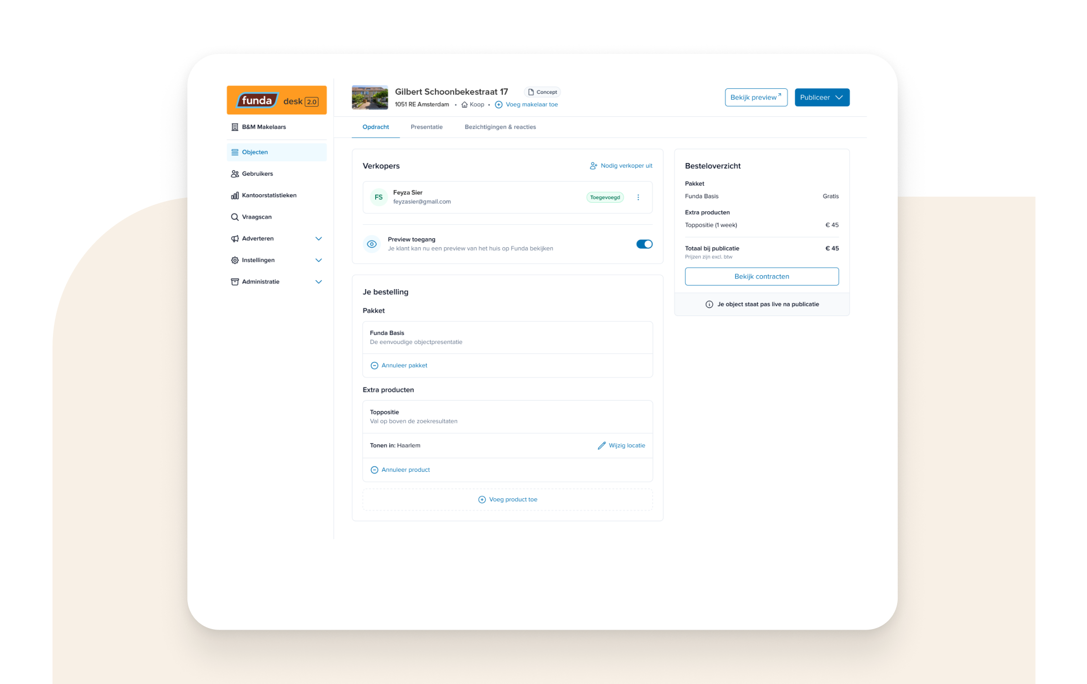 Publiceren gebeurt dus niet meer automatisch. Ook als je gewend was dat een object direct live ging, publiceer je dat voortaan zelf vanuit Funda Desk 2.0. Tot het moment van publicatie kun je je bestelling aanpassen of annuleren. Publiceer je het object? Dan staan je keuzes vast.