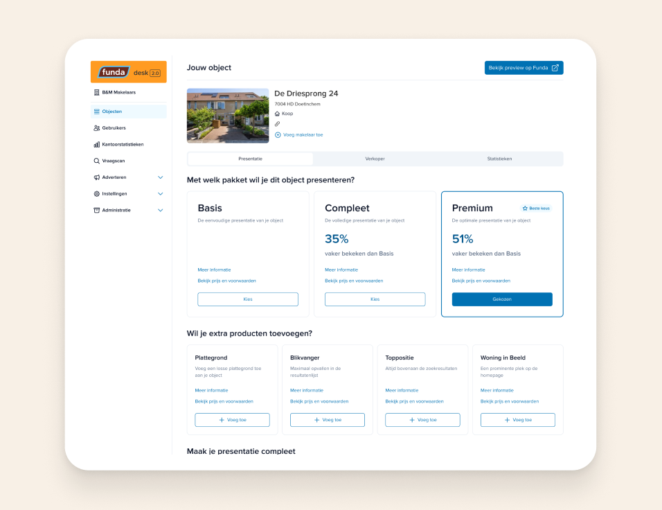 Makelaars kunnen hun presentatiepakket nu op elk moment upgraden, ook nadat een object live staat. Zo houden ze maximale flexibiliteit zonder dubbele kosten.