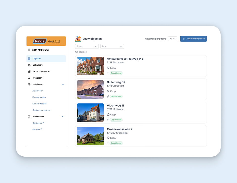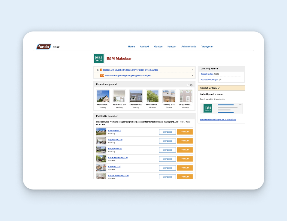 Funda Desk is al ruim twintig jaar het systeem waar je als makelaarskantoor je objecten en kantoor beheert, facturen bekijkt, promotieproducten koopt en inzicht in de markt krijgt. En dat het systeem al twintig jaar meegaat, dat merk je. Je kent de weg, maar de navigatie is complex, media uploaden duurt lang en de woning staat live voordat de verkoper heeft kunnen meekijken.