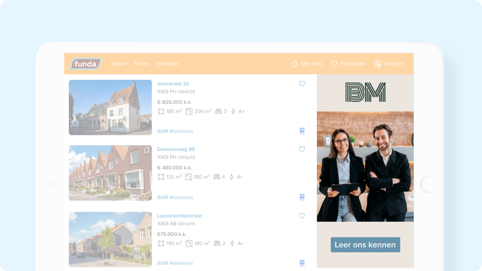 Wil je meer opdrachten binnenhalen of je naamsbekendheid in jouw regio vergroten? Via Funda word je gezien op een prominente plek: tussen en naast de zoekresultaten van actieve woningzoekers in jouw doelgroep. Kies één positie of combineer meerdere opties voor extra impact – wij adviseren je graag over de slimste aanpak.