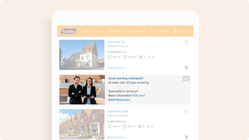 Op Funda kun je jouw advertenties heel gericht targeten op een doelgroep die voor jou relevant is. Niet alleen in je eigen regio, maar ook in een specifiek segment dat voor jou relevant is. Door regelmatig zichtbaar te zijn bij precies die zoekers, vergroot je gericht de naamsbekendheid van je kantoor.