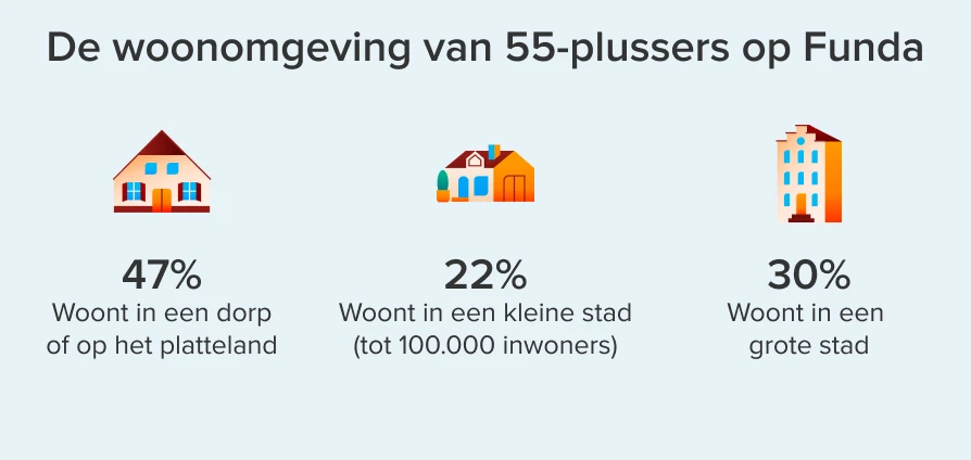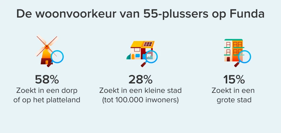 In juli 2025 deden we onderzoek onder ruim 900 Funda-bezoekers die binnenkort willen verhuizen. We lichten daarbij de antwoorden van 55-plussers uit: een groep die moeite heeft met het vinden van passend aanbod, waardoor de doorstroom op de markt stagneert. Wat zoeken zij? En wat zijn de belangrijkste redenen om te blijven zitten waar ze zitten?