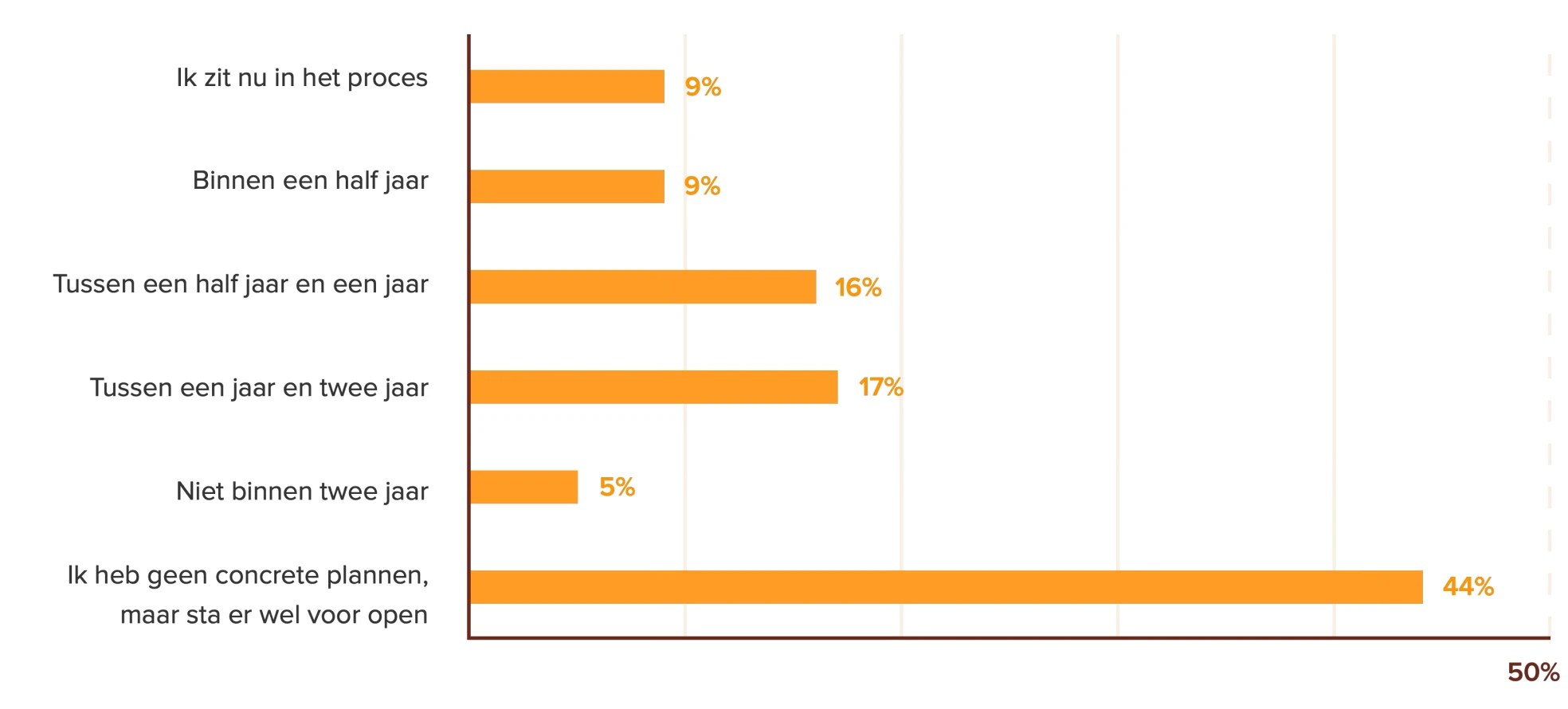 44% van de 55-plussers op Funda geeft aan geen concrete verhuisplannen te hebben, maar staat wel open voor een verhuizing. Daarmee zijn zij iets passiever op de markt dan jongere woningzoekers.