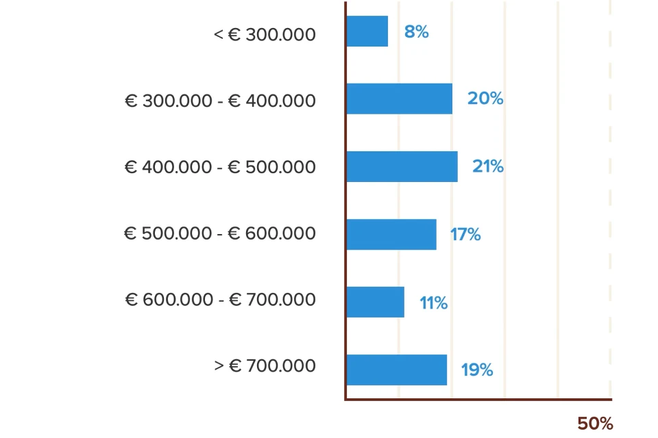 55-plussers zoeken vaker in de hogere prijsklassen dan jongere woningzoekers. Het aandeel dat boven de 7 ton zoekt, is bijna twee keer zo groot.