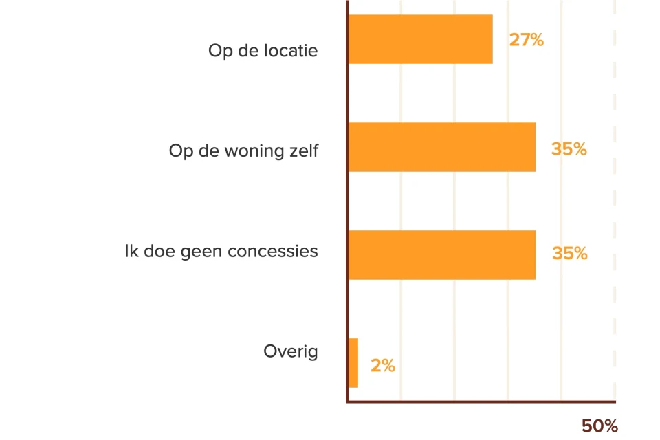 35% van de 55-plussers doet geen concessies in hun woonwensen, veel vaker dan jongeren (22%). Als ze het wél doen, dan liever op de woning dan op de locatie.