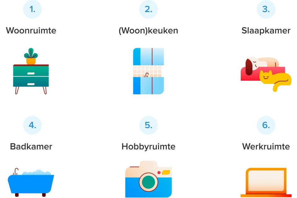 Orden onderstaande ruimtes van een woning die voor jou het meest belangrijk zijn.