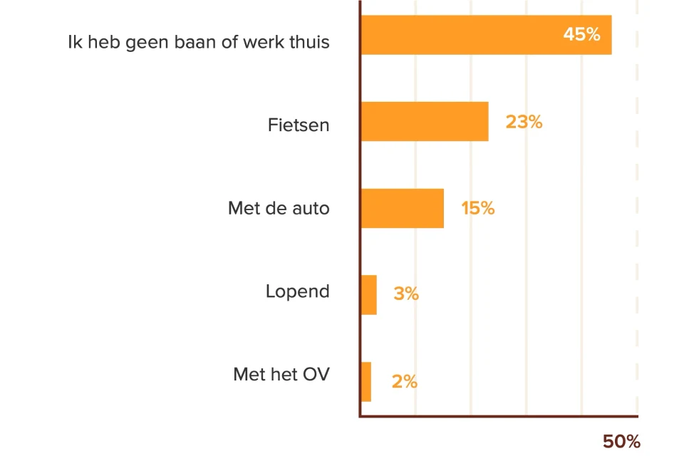 Van de 55-plussers die naar hun werk reizen, pakken de meesten de fiets. Ook de auto wordt nog vaak gebruikt. Slechts een klein deel gaat lopend of met het ov.